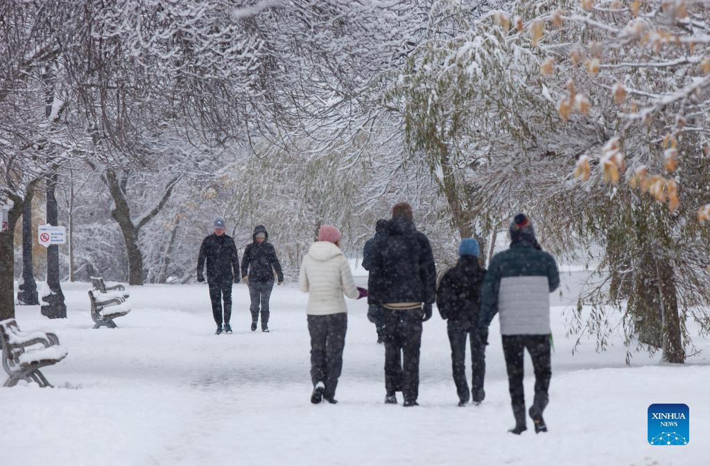 People walk in the snow during a snowy day in a park in Toronto, Ontario, Canada, on Nov. 28, 2021. A snowfall hit much of southern Ontario on Sunday. (Photo by Zou Zheng/Xinhua)