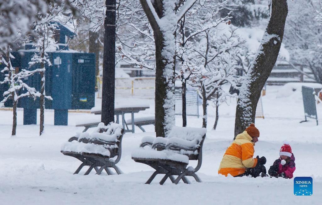 People play in the snow during a snowy day in a park in Toronto, Ontario, Canada, on Nov. 28, 2021. A snowfall hit much of southern Ontario on Sunday. (Photo by Zou Zheng/Xinhua)