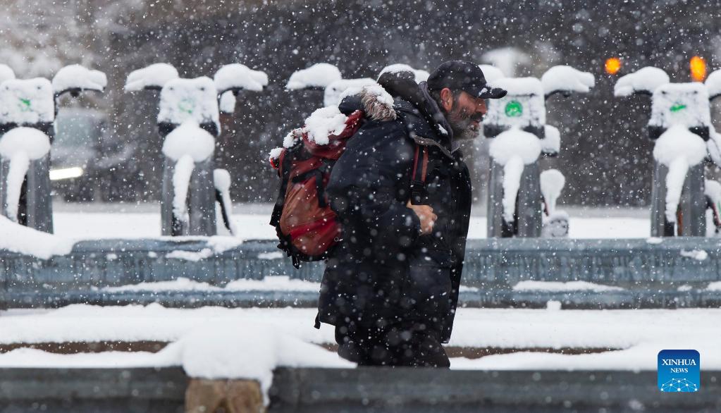 A man walks on a street during a snowy day in Toronto, Ontario, Canada, on Nov. 28, 2021. A snowfall hit much of southern Ontario on Sunday. (Photo by Zou Zheng/Xinhua)