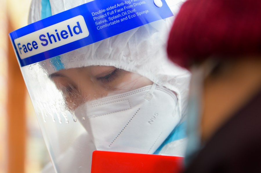 A staff member helps a resident to present personal health information at a testing site in Manzhouli, north China's Inner Mongolia Autonomous Region, Nov. 29, 2021. (Xinhua/Li Zhipeng)