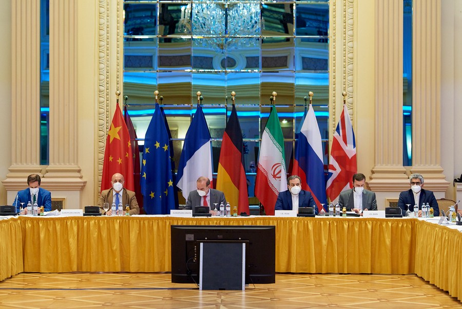 Photo taken on June 20, 2021 shows a meeting of the Joint Comprehensive Plan of Action (JCPOA) Joint Commission in Vienna, Austria. (EU Delegation Vienna/Handout via Xinhua)