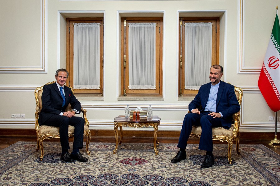 Iranian Foreign Minister Hossein Amir Abdollahian (R) meets with the International Atomic Energy Agency (IAEA) Director General Rafael Grossi in Tehran, Iran, on Nov. 23, 2021. (Xinhua)