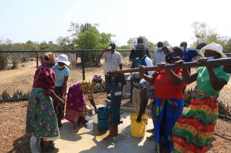 Photo shows villagers drawing water from a China-aided borehole in Lumene village in Gwanda district, Matabeleland South Province of Zimbabwea. The borehole completed in August 2021 has provided a constant supply of water for more than 300 residents of Lumene village and more than one thousand people in the surrounding villages.