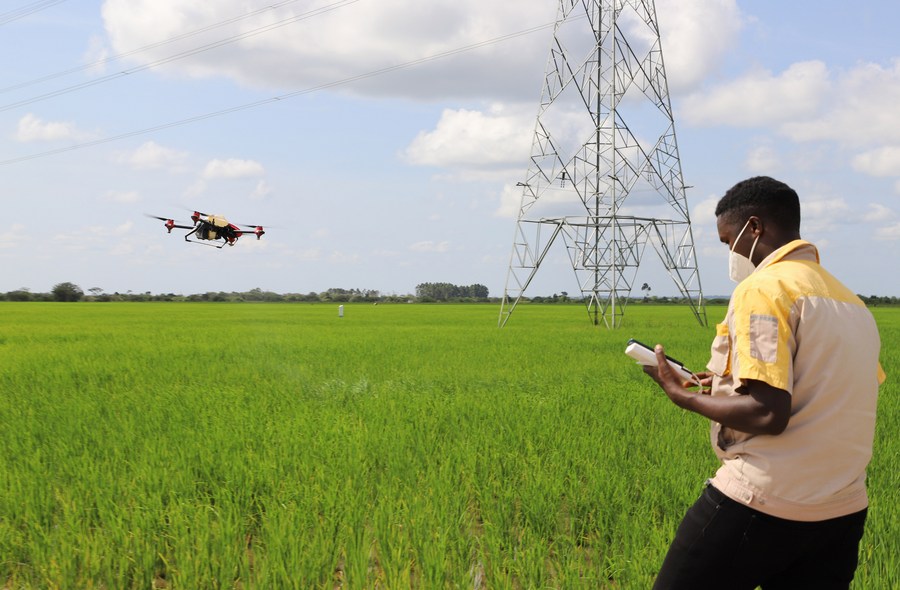 Local technician Herbert Agaba controls a plant protection drone to spray pesticides at a Chinese-run rice farm in Lukaya, Kalungu District in Uganda, June 2, 2021. (Xinhua/Zhang Gaiping)