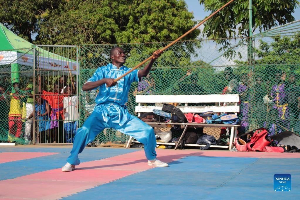 A man performs martial arts at a regional Chinese Martial Arts competition organised in Cotonou, Benin, Nov. 28, 2021. (Photo by Seraphin Zounyekpe/Xinhua)