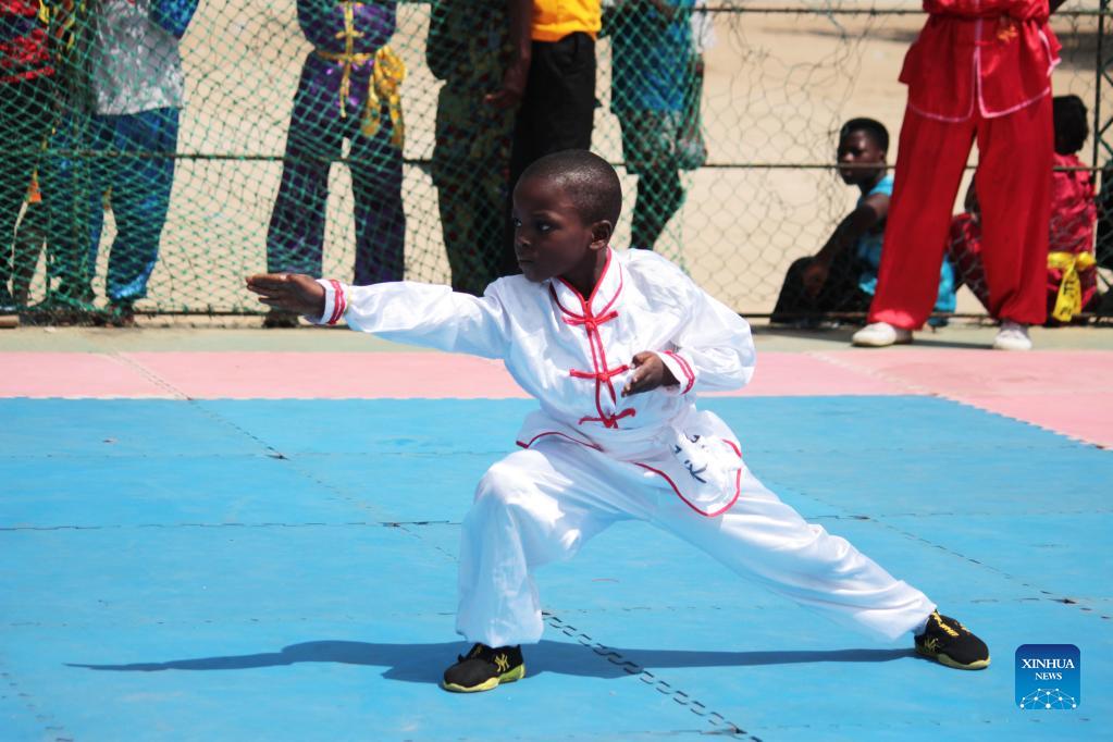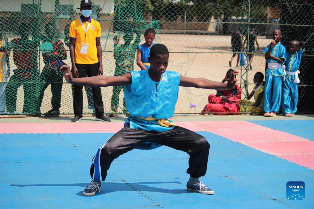 A boy performs martial arts at a regional Chinese Martial Arts competition organised in Cotonou, Benin, Nov. 28, 2021. (Photo by Seraphin Zounyekpe/Xinhua)
