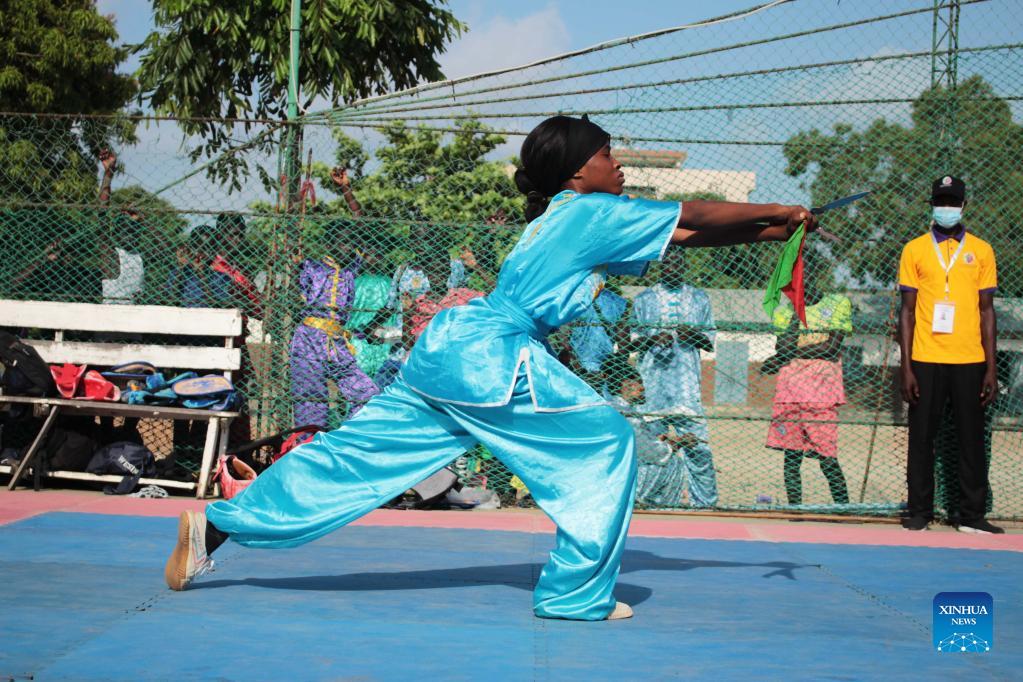 A woman performs martial arts at a regional Chinese Martial Arts competition organised in Cotonou, Benin, Nov. 28, 2021. (Photo by Seraphin Zounyekpe/Xinhua)