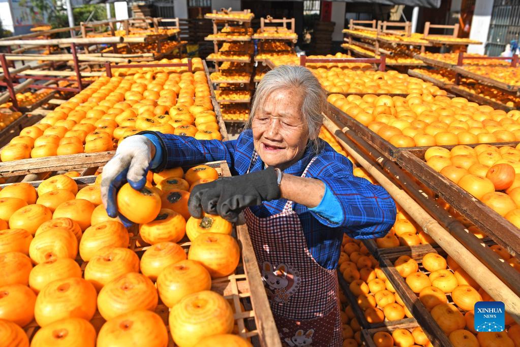 A villager dries persimmons in Gongcheng Yao Autonomous County, south China's Guangxi Zhuang Autonomous Region, Nov. 29, 2021. Persimmons are in season here and the fruit is ripe on the branches. Village workers are busy picking and drying the fruit. (Xinhua/Zhou Hua)
