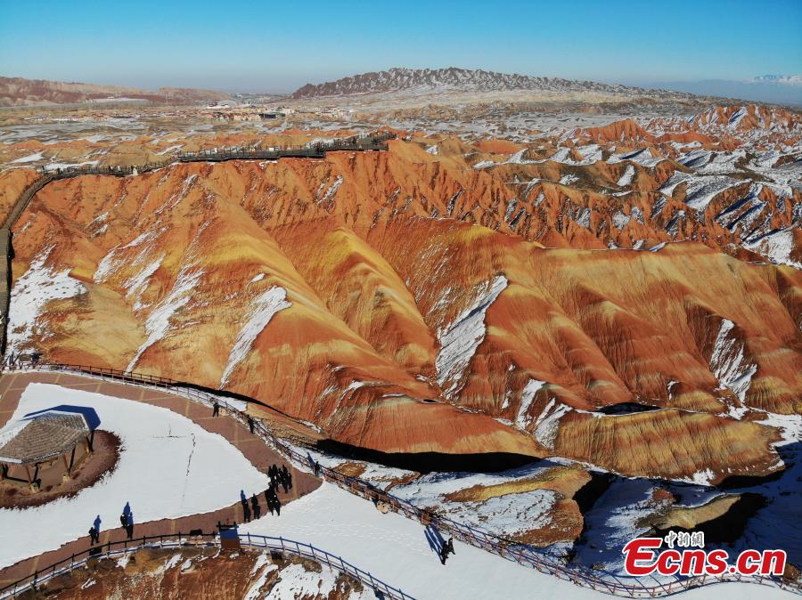Photo taken on Nov. 29, 2021 shows the Danxia National Geological Park after snowfall, Zhangye City, northwest China's Gansu Province. (Photo: China News Service/Zhang Yanmin)