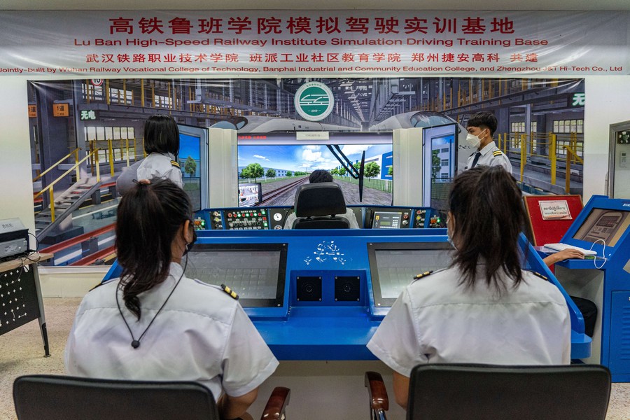 Preeyaporn and her classmates are operating a train driver simulator, the centerpiece of the Lu Ban High-Speed Railway Institute, which was established in Banphai Industrial and Community Education College in Thailand's northeastern province of Khon Kaen, in a collaborative effort with the WRC in China.