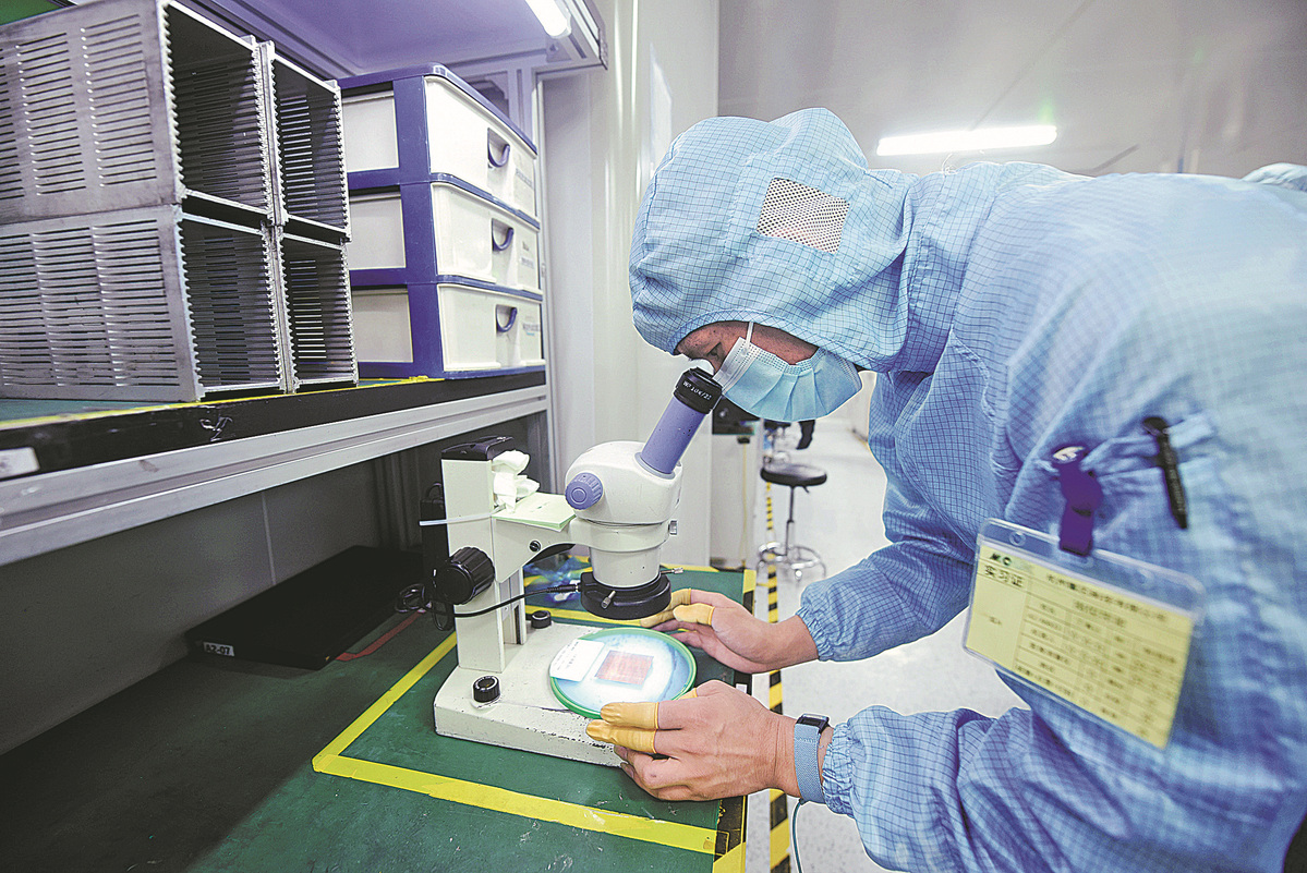 A technician checks chips at a technology company in Hangzhou, Zhejiang province. (Photo by Long Wei/for China Daily)