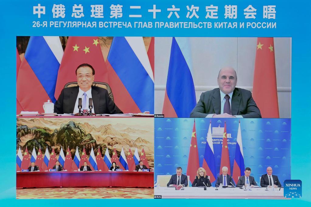 Chinese Premier Li Keqiang co-chairs the 26th regular meeting with Russian Prime Minister Mikhail Mishustin via video link at the Great Hall of the People in Beijing, capital of China, Nov. 30, 2021. Chinese Vice Premier Han Zheng, who co-chairs the China-Russia Investment Cooperation Committee and the China-Russia Energy Cooperation Committee, attended the meeting. (Xinhua/Li Xiang)