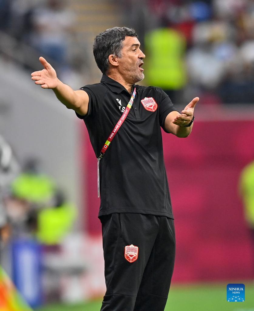 Bahrain's head coach Helio Sousa gestures during the FIFA Arab Cup 2021 Group A match between Qatar and Bahrain in Al Khor, Qatar, Nov. 30, 2021. (Photo by Nikku/Xinhua)