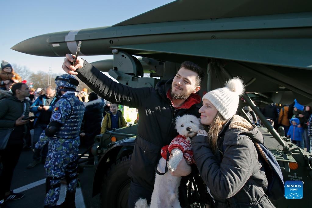 People take a selfie after the National Day military parade at the Arch of Triumph in Bucharest, Romania, Dec. 1, 2021. (Photo by Cristian Cristel/Xinhua)