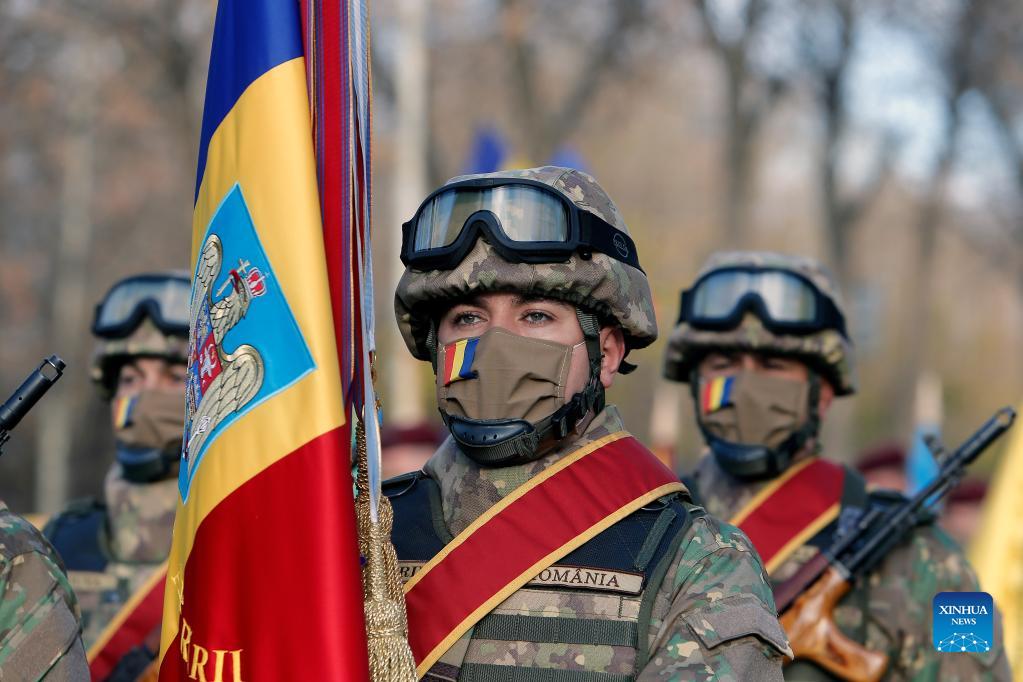 Soldiers attend the National Day military parade at the Arch of Triumph in Bucharest, Romania, Dec. 1, 2021. (Photo by Cristian Cristel/Xinhua)