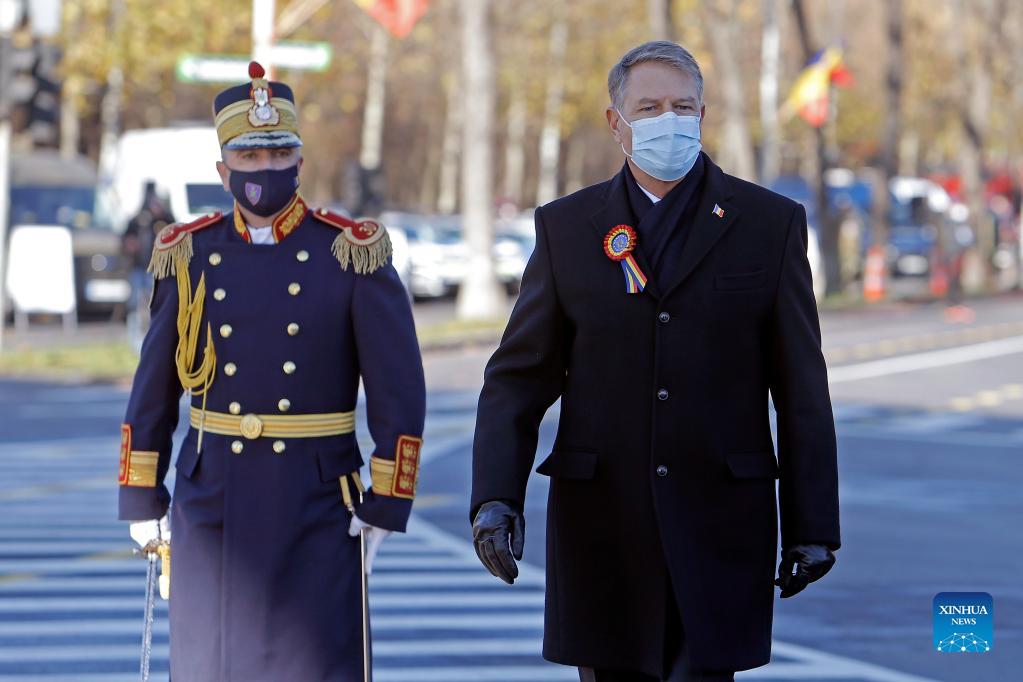 Romanian President Klaus Iohannis attends the National Day military parade at the Arch of Triumph in Bucharest, Romania, Dec. 1, 2021. (Photo by Cristian Cristel/Xinhua)