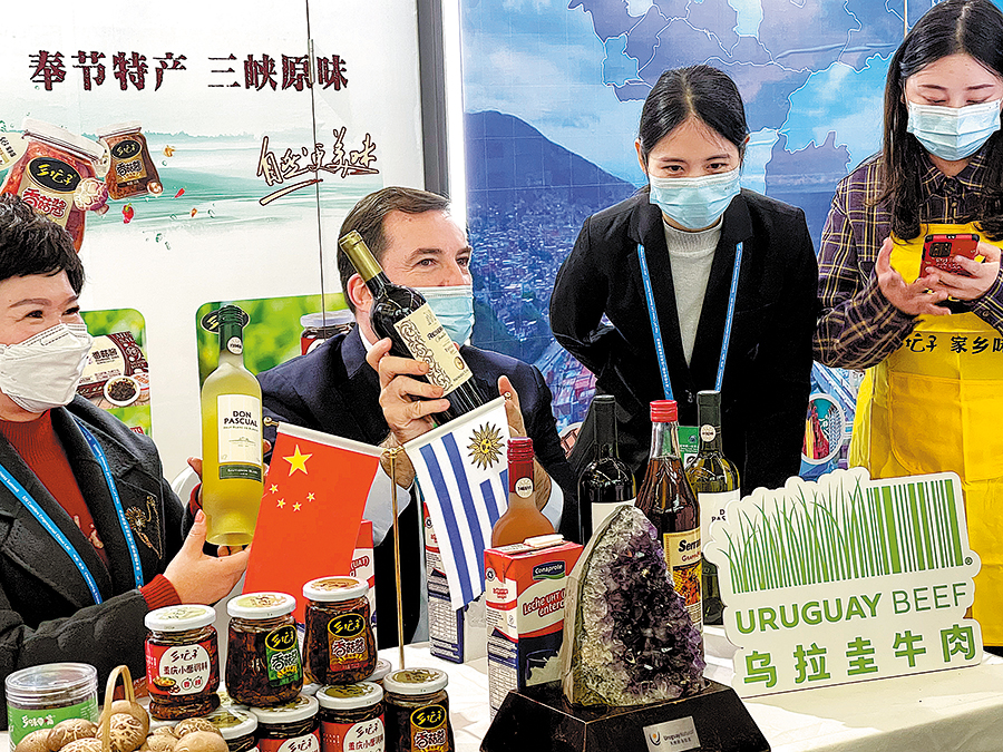 Fernando Lugris (second from left), Uruguay's ambassador to China, promotes Uruguayan wines via social platforms on the sidelines of a trade event in Chongqing. (Photo by Tan Yingzi/China Daily)
