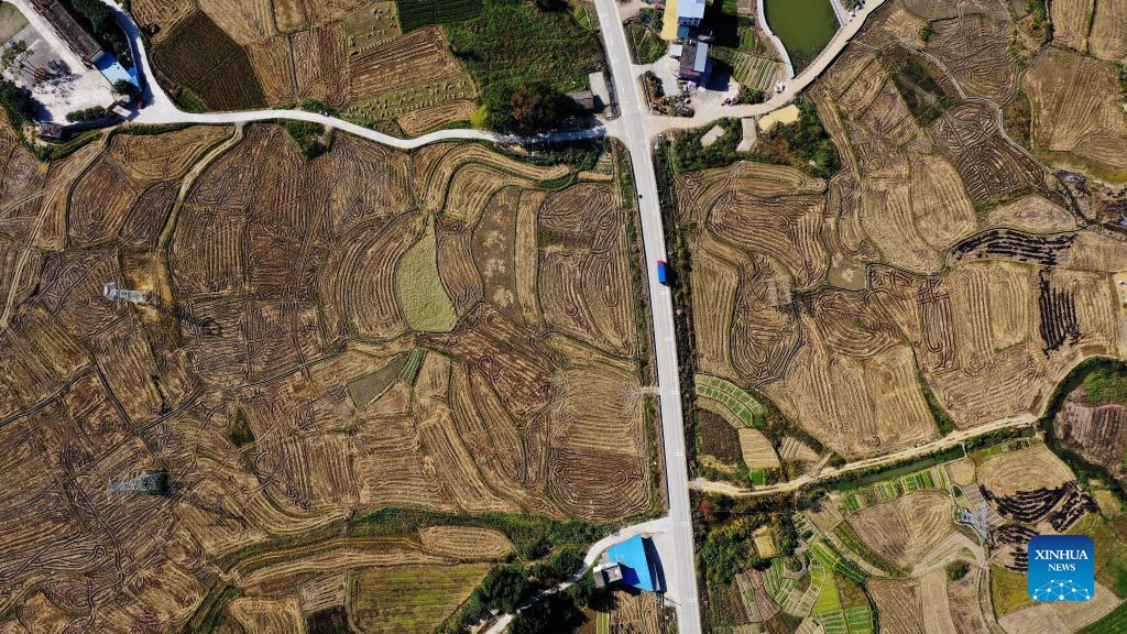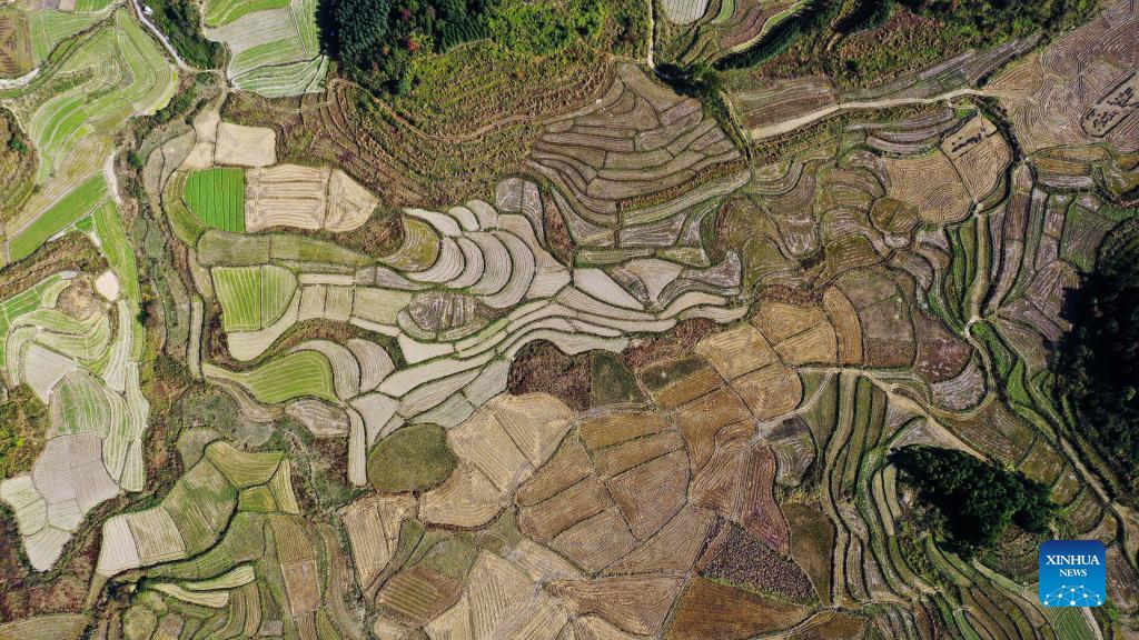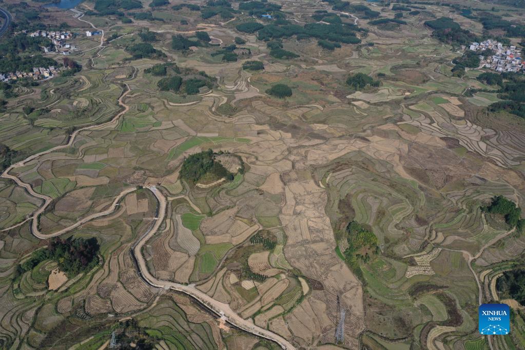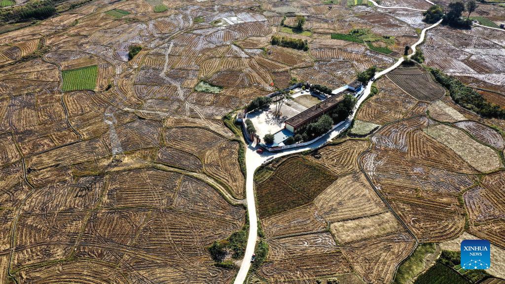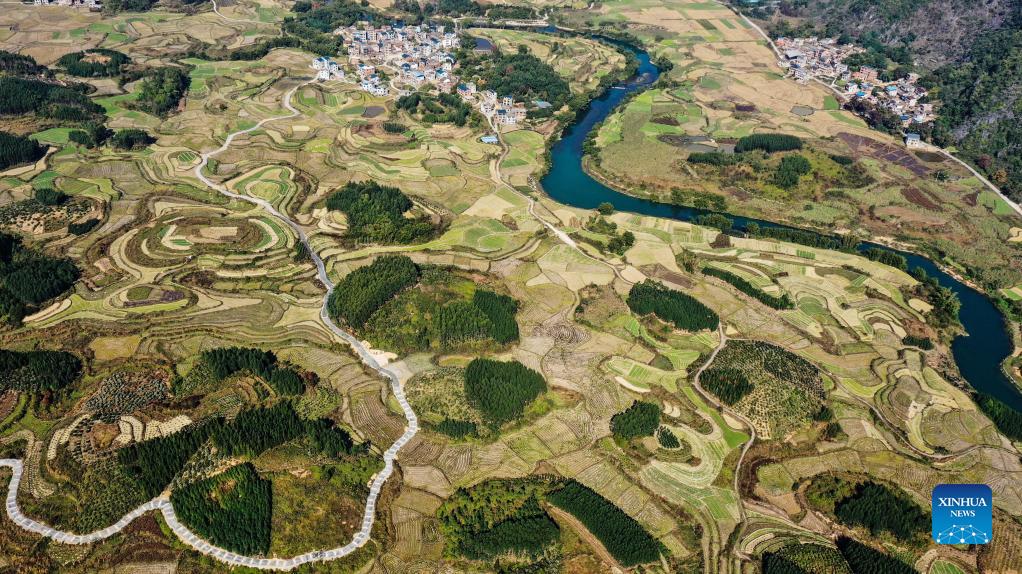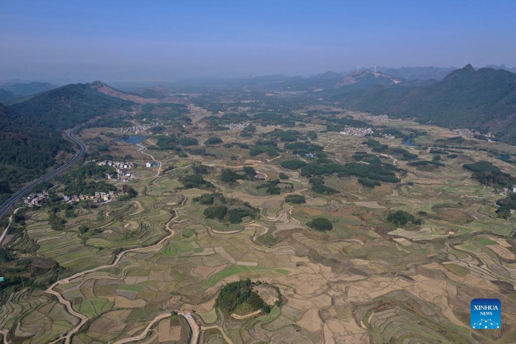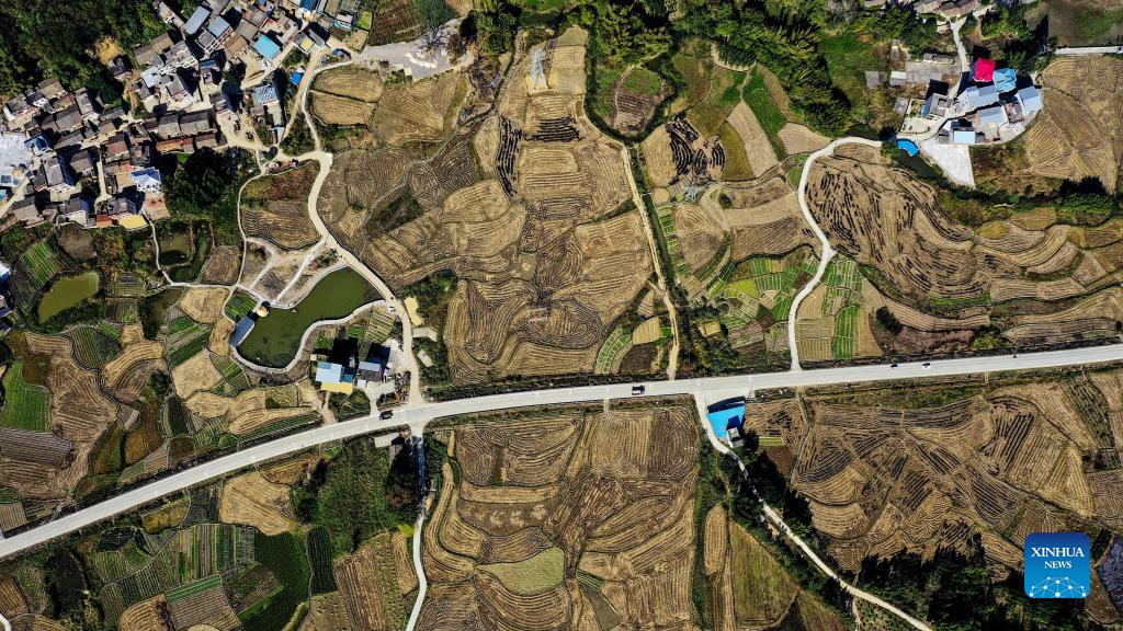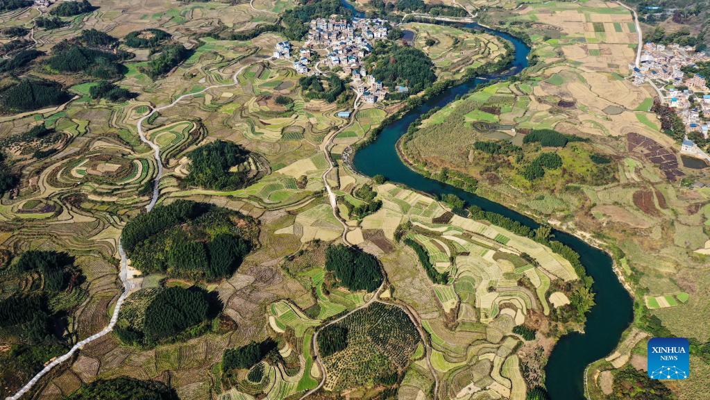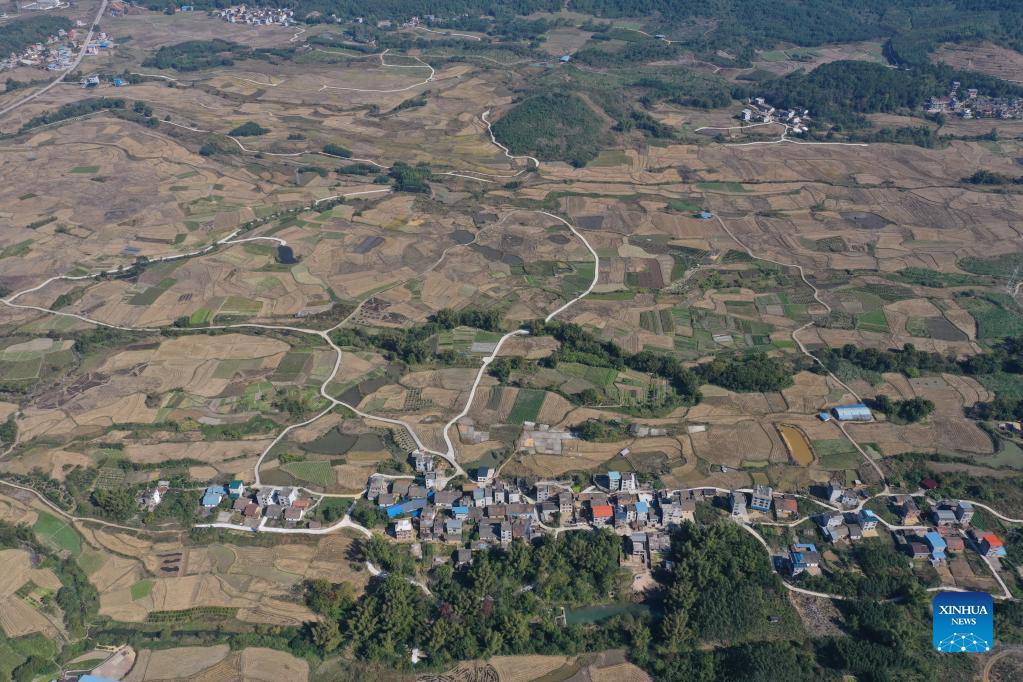 Aerial photo taken on Dec. 2, 2021 shows the scenery of Xingui Village, Tantou Township, Rong'an County, south China's Guangxi Zhuang Autonomous Region. (Xinhua/Zhang Ailin)