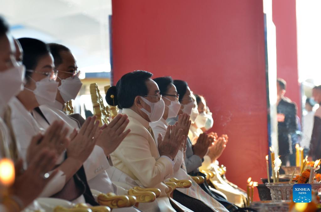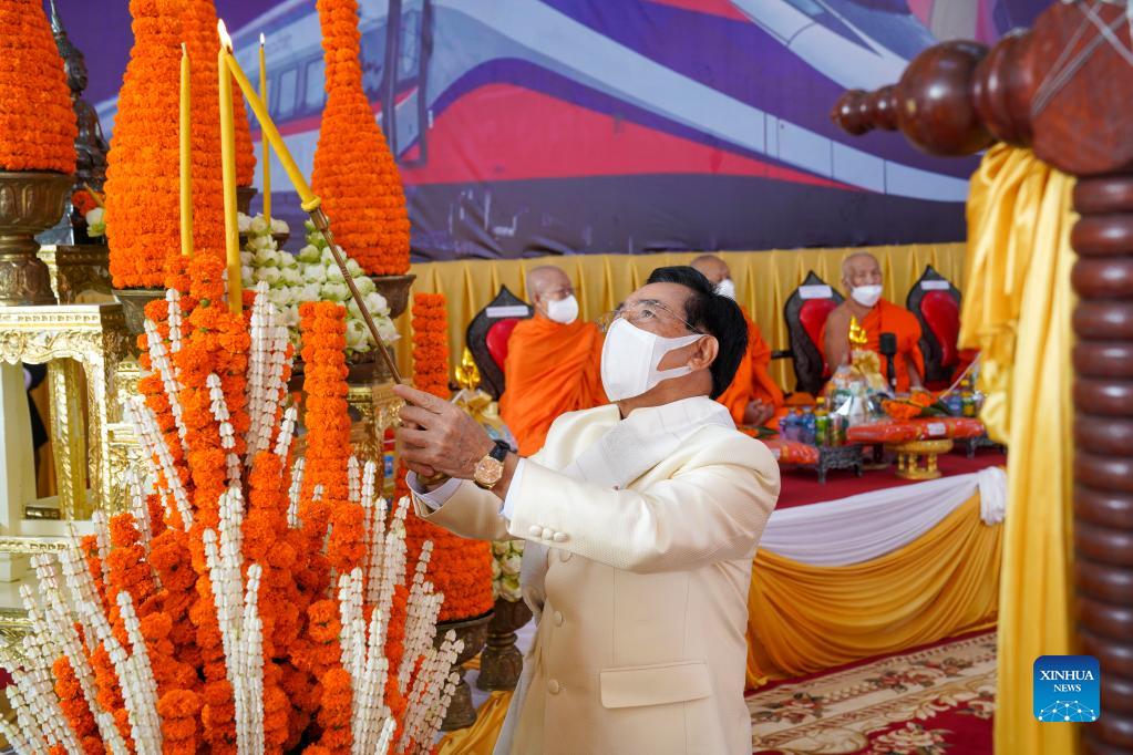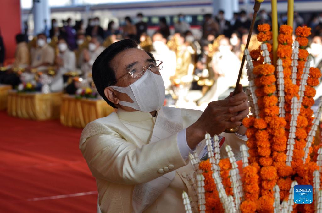 Lao Prime Minister Phankham Viphavanh attends a traditional Lao ceremony praying for the smooth operation of the China-Laos Railway in Vientiane, Laos, Dec. 2, 2021. The China-Laos railway, with a length of 1,035 km and connecting Kunming of southwest China's Yunnan Province and Vientiane, is scheduled to start operation on Friday. The construction of the China-Laos railway started in December 2016. The electrified passenger and cargo railway is built with the full application of Chinese management and technical standards. (Xinhua/Zhang Jianhua)