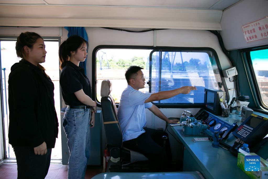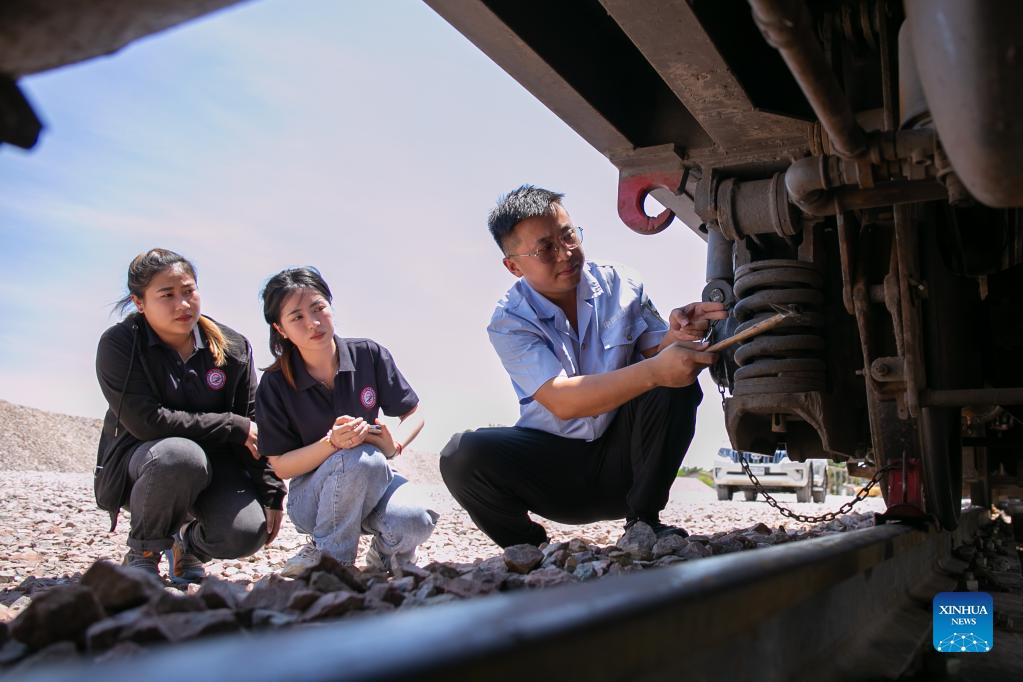 Sida Phengphongsawanh (C) learns to inspect a train from a Chinese instructor at the China Railway No. 2 Engineering Group (CREC-2) railing base for the China-Laos railway, on the northern outskirts of Vientiane, capital of Laos, Sept. 12, 2021. Sida Phengphongsawanh, 22, is a trainee for China-Laos railway train driver. The China-Laos Railway, which connects Kunming in China's Yunnan Province with Lao capital Vientiane, is the first railway project built with Chinese investment, jointly operated by China and Laos and directly connected to China's railway network. While building the railway, the Laos-China Railway Co., Ltd. has opened training course for around 600 Lao trainees to learn train driving, scheduling and maintenance. Sida is one of them. "I heard about the Laos-China railway for the first time in 2015. In 2016, I went to Kunming to study the knowledge of railways. After returning home, I went straight to the Laos-China Railway Co., Ltd. to apply for a position. I hope to be an excellent female driver on the Laos-China railway," Sida said. (Photo by Kaikeo Saiyasane/Xinhua)