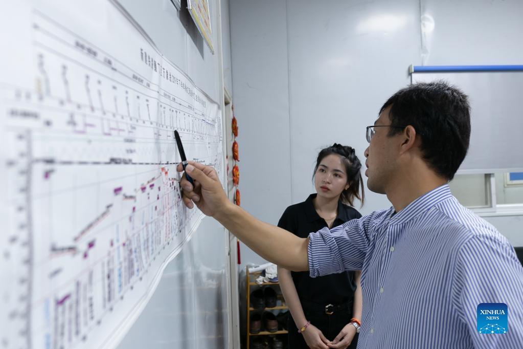 Sida Phengphongsawanh (L) learns about the railway construction progress from a Chinese railway project manager at the China Railway No. 2 Engineering Group (CREC-2) railing base for the China-Laos railway, on the northern outskirts of Vientiane, capital of Laos, Oct. 1, 2021. Sida Phengphongsawanh, 22, is a trainee for China-Laos railway train driver. The China-Laos Railway, which connects Kunming in China's Yunnan Province with Lao capital Vientiane, is the first railway project built with Chinese investment, jointly operated by China and Laos and directly connected to China's railway network. While building the railway, the Laos-China Railway Co., Ltd. has opened training course for around 600 Lao trainees to learn train driving, scheduling and maintenance. Sida is one of them. "I heard about the Laos-China railway for the first time in 2015. In 2016, I went to Kunming to study the knowledge of railways. After returning home, I went straight to the Laos-China Railway Co., Ltd. to apply for a position. I hope to be an excellent female driver on the Laos-China railway," Sida said. (Photo by Kaikeo Saiyasane/Xinhua)