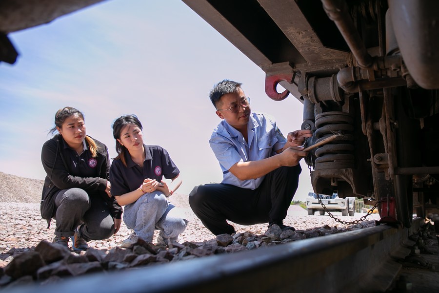 Sida Phengphongsawanh (C) learns to inspect a train from a Chinese instructor at the China Railway No. 2 Engineering Group (CREC-2) railing base for the China-Laos railway, on the northern outskirts of Vientiane, capital of Laos, Sept. 12, 2021. (Photo by Kaikeo Saiyasane/Xinhua)