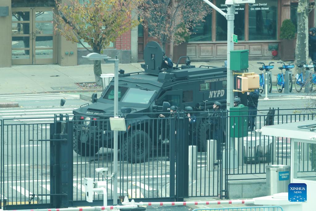 Police officers are seen near the UN headquarters building in New York, the United States, on Dec. 2, 2021. The UN headquarters building in New York was on lockdown Thursday after a man with a shotgun was spotted outside. (Xinhua/Wang Jiangang)