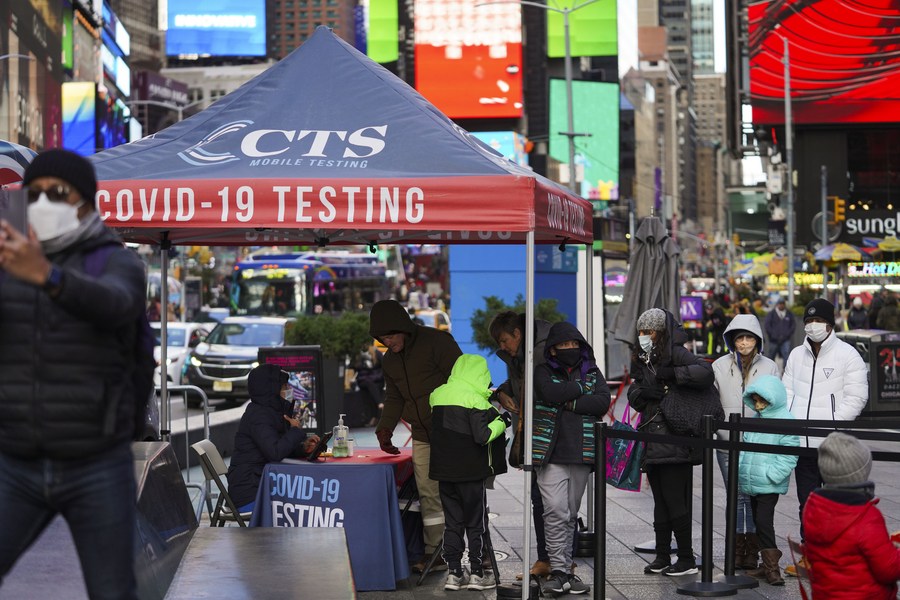 People wait for COVID-19 tests on Times Square in New York, the United States, Nov. 23, 2021.(Xinhua/Wang Ying)
