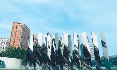 Photo shows a sculpture consisting of a group of stainless mirror objects placed at the entrance of the sunken plaza of the Olympic Village in Beijing. (Photo/People’s Daily Overseas Edition)