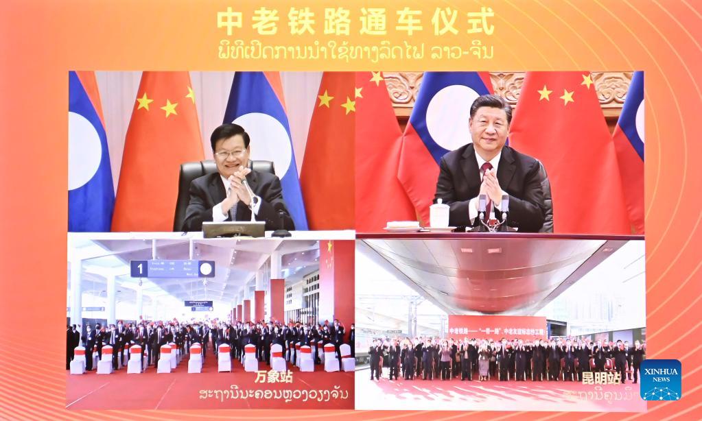 Xi Jinping, general secretary of the Communist Party of China Central Committee and Chinese president, and Thongloun Sisoulith, general secretary of the Lao People's Revolutionary Party Central Committee and Lao president, jointly witness the opening of the China-Laos railway via video link, Dec. 3, 2021. (Xinhua/Huang Jingwen)