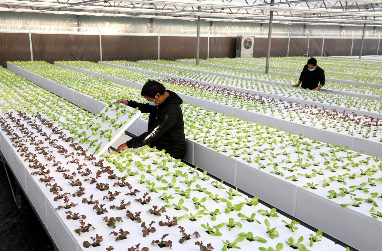 Staff members of a high-tech agricultural park in Gaocheng district, Shijiazhuang city, north China’s Hebei province, check the condition of vegetables growing in aeroponic system, Nov. 27, 2021. (Photo by Liang Zidong/People’s Daily Online)