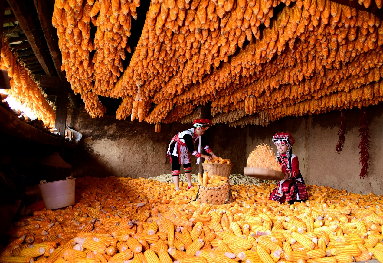 Residents of Yi ethnic group in Youzha village, Xiyi township, Mile city, southwest China’s Yunnan province, air newly harvested corn, Nov. 13, 2021. (Photo by Pu Jiayong /People’s Daily Online)