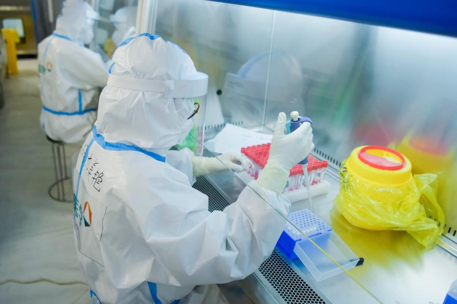 A staff member works in a "Falcon" air-inflated laboratory for COVID-19 nucleic acid testing in Manzhouli, north China's Inner Mongolia Autonomous Region, Dec. 3, 2021. (Xinhua/Li Zhipeng)