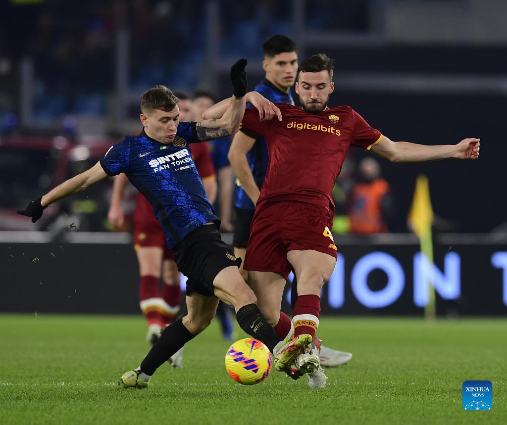 Inter Milan's Nicol Barella (L) vies with Roma's Bryan Cristante during a Serie A football match between AS Roma and Inter Milan in Rome, Italy, on Dec. 4, 2021. (Photo by Augusto Casasoli/Xinhua)