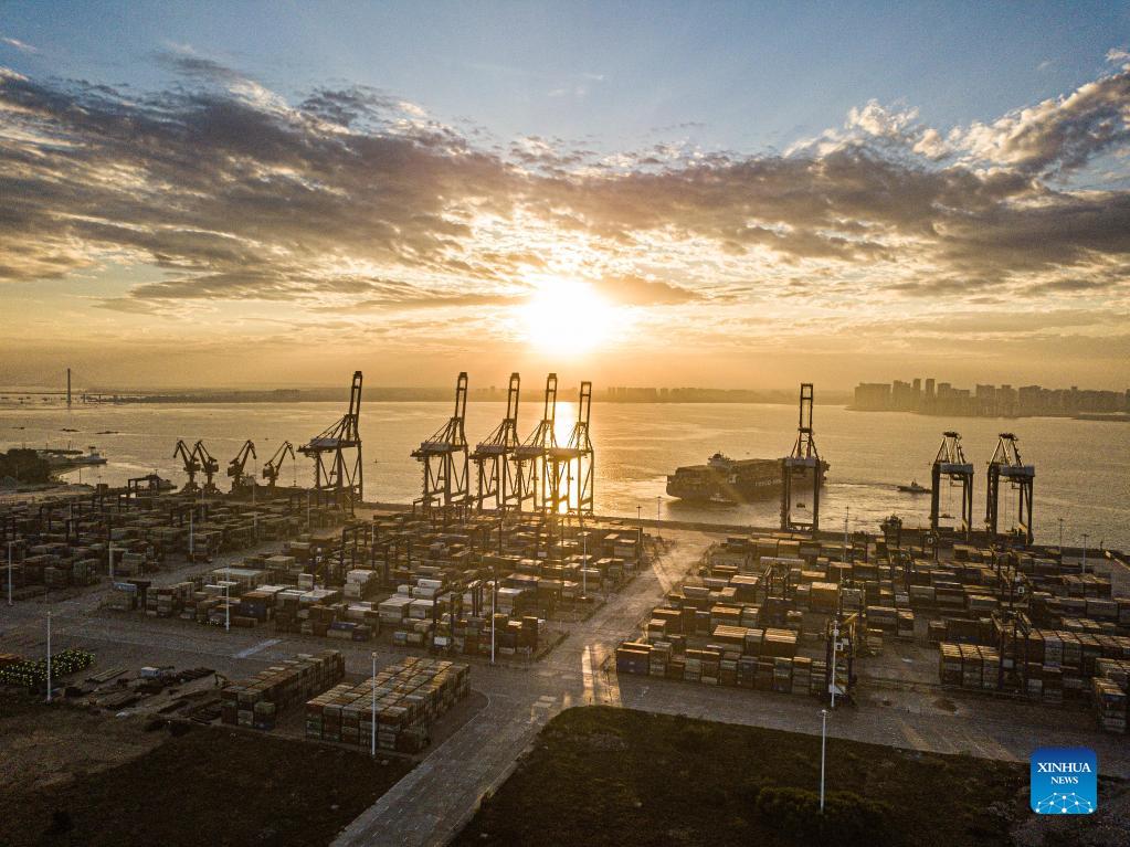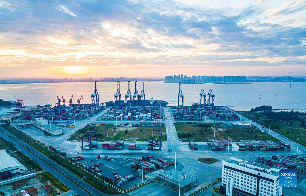 Aerial photo taken on Dec. 5, 2021 shows the sunrise scenery of the Yangpu international container port at Yangpu economic development zone in south China's Hainan Province. (Xinhua/Pu Xiaoxu)