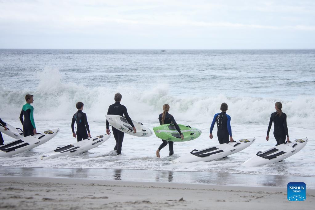 People participate in water sports on the seaside in Cape Town, South Africa, Dec. 5, 2021. South Africa has entered the fourth wave of the pandemic with the new variant at the center of the rise in cases, Health Minister Joe Phaahla said at a briefing on Friday. (Xinhua/Lyu Tianran)