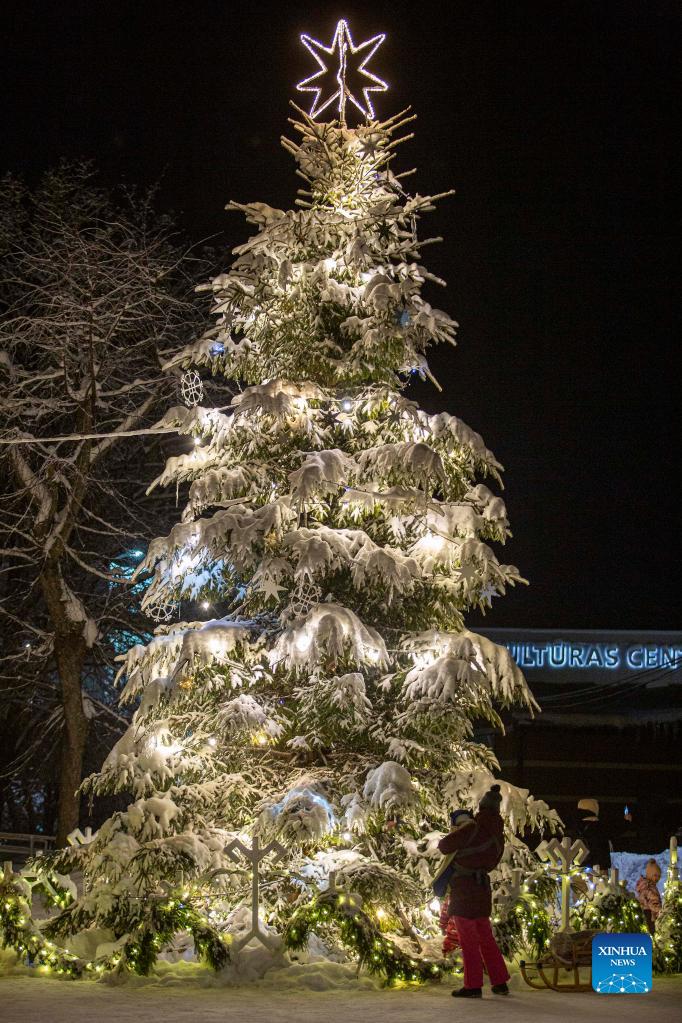 People enjoy Christmas lights in Ogre, Latvia, on Dec. 5, 2021. (Photo by Edijs Palens/Xinhua)