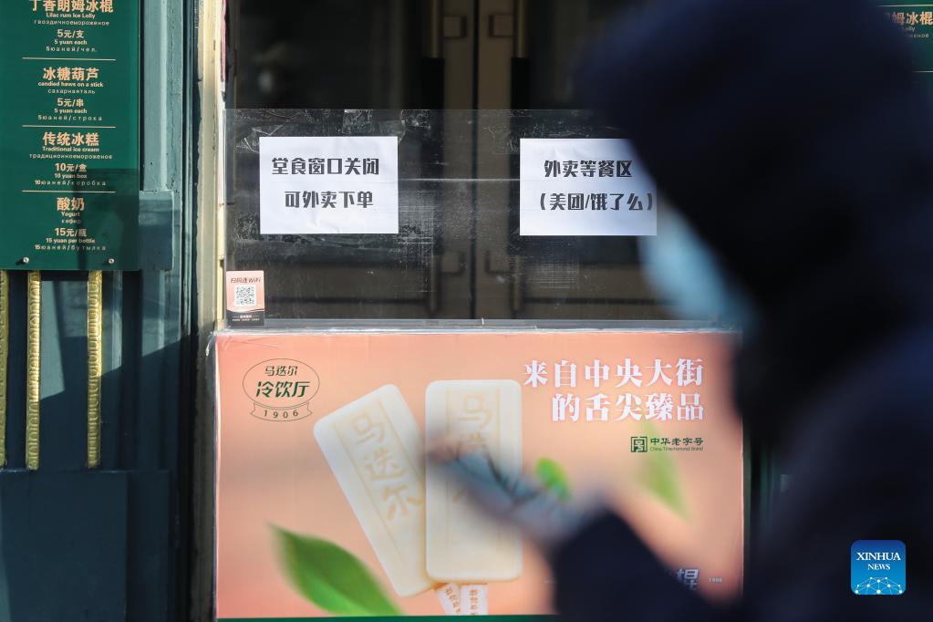A citizen orders food using a smartphone on the Central Street in Harbin, northeast China's Heilongjiang Province, Dec. 5, 2021. Harbin announced on Saturday that all restaurants would suspend eat-in service and would only be able to offer pick-up or take-away orders. Besides, all commercial establishments other than those essential to people's daily lives were closed. (Xinhua/Zhang Tao)