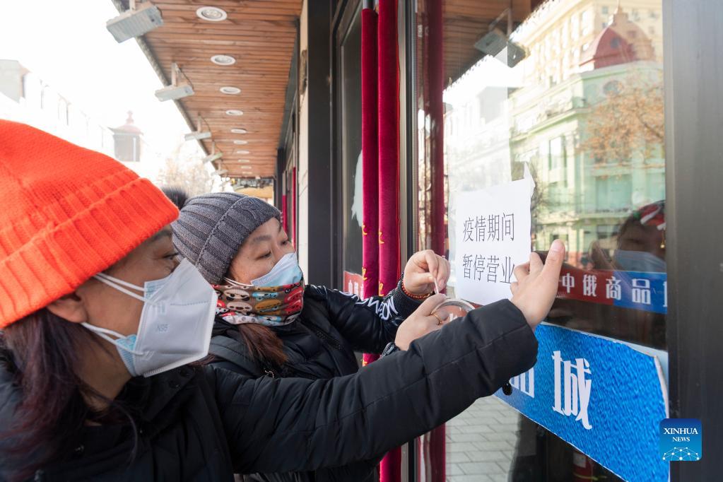 Staff members put up a notice saying that their store is temporarily closed on the Central Street in Harbin, northeast China's Heilongjiang Province, Dec. 5, 2021. Harbin announced on Saturday that all restaurants would suspend eat-in service and would only be able to offer pick-up or take-away orders. Besides, all commercial establishments other than those essential to people's daily lives were closed. (Xinhua/Xie Jianfei)