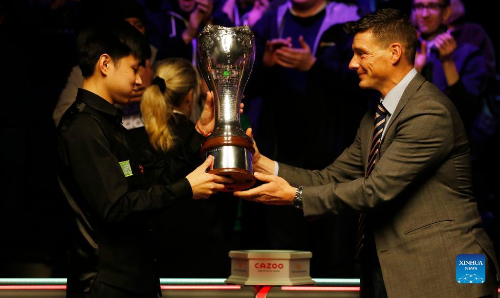 Zhao Xintong (L) of China is presented with the trophy after winning the final match against Luca Brecel of Belgium at 2021 UK Snooker Championship in York, Britain on Dec. 5, 2021. Zhao beat Brecel 10-5 and claimed the title. (Photo by Craig Brough/Xinhua)