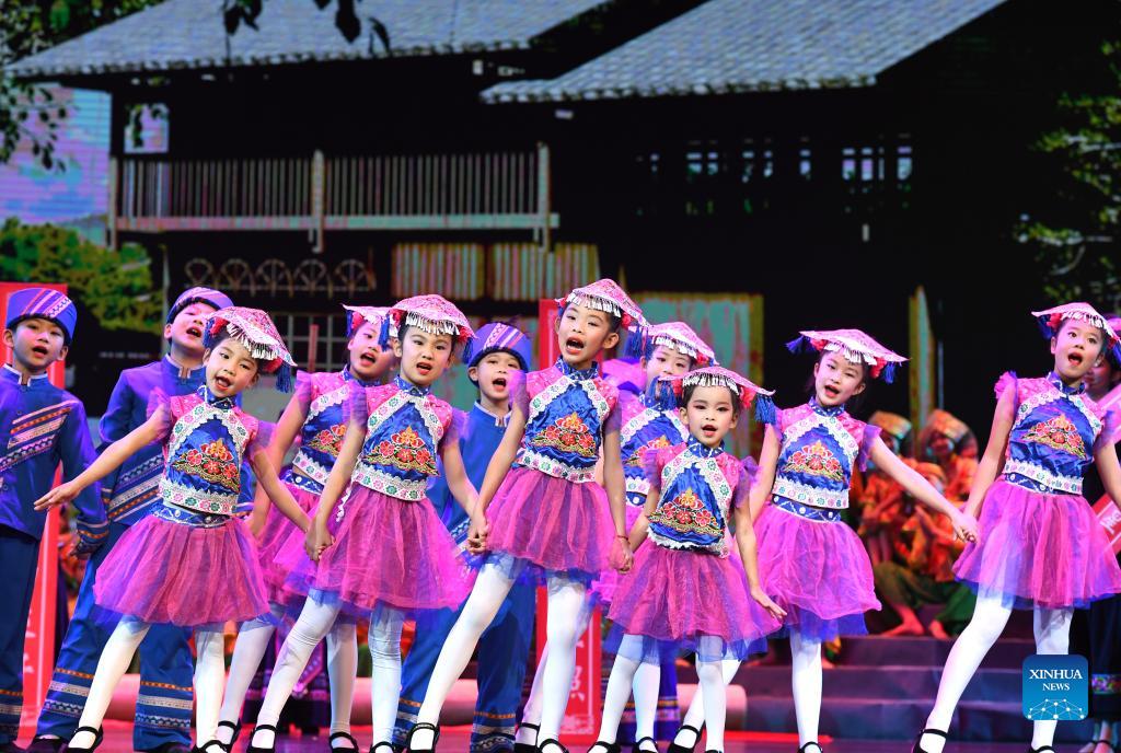 Children sing folk songs of Zhuang ethnic group during a performance in Nanning, capital of south China's Guangxi Zhuang Autonomous Region, Dec. 4, 2021. (Xinhua/Zhou Hua)
