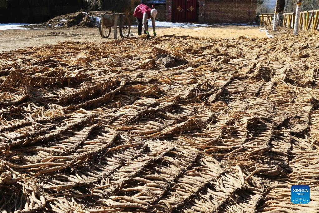 Villagers sort and dry dangshen root from the plant codonopsis pilosula, often used in traditional Chinese medicine (TCM), in Zhangxian County of Dingxi City, northwest China's Gansu Province, on Dec. 5, 2021. In recent years, Zhangxian County has adjusted its farming structure and focused on developing raw materials for the medicine industry. (Xinhua/Wang Kexian)