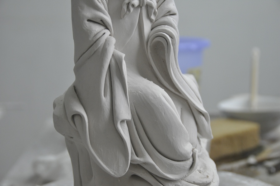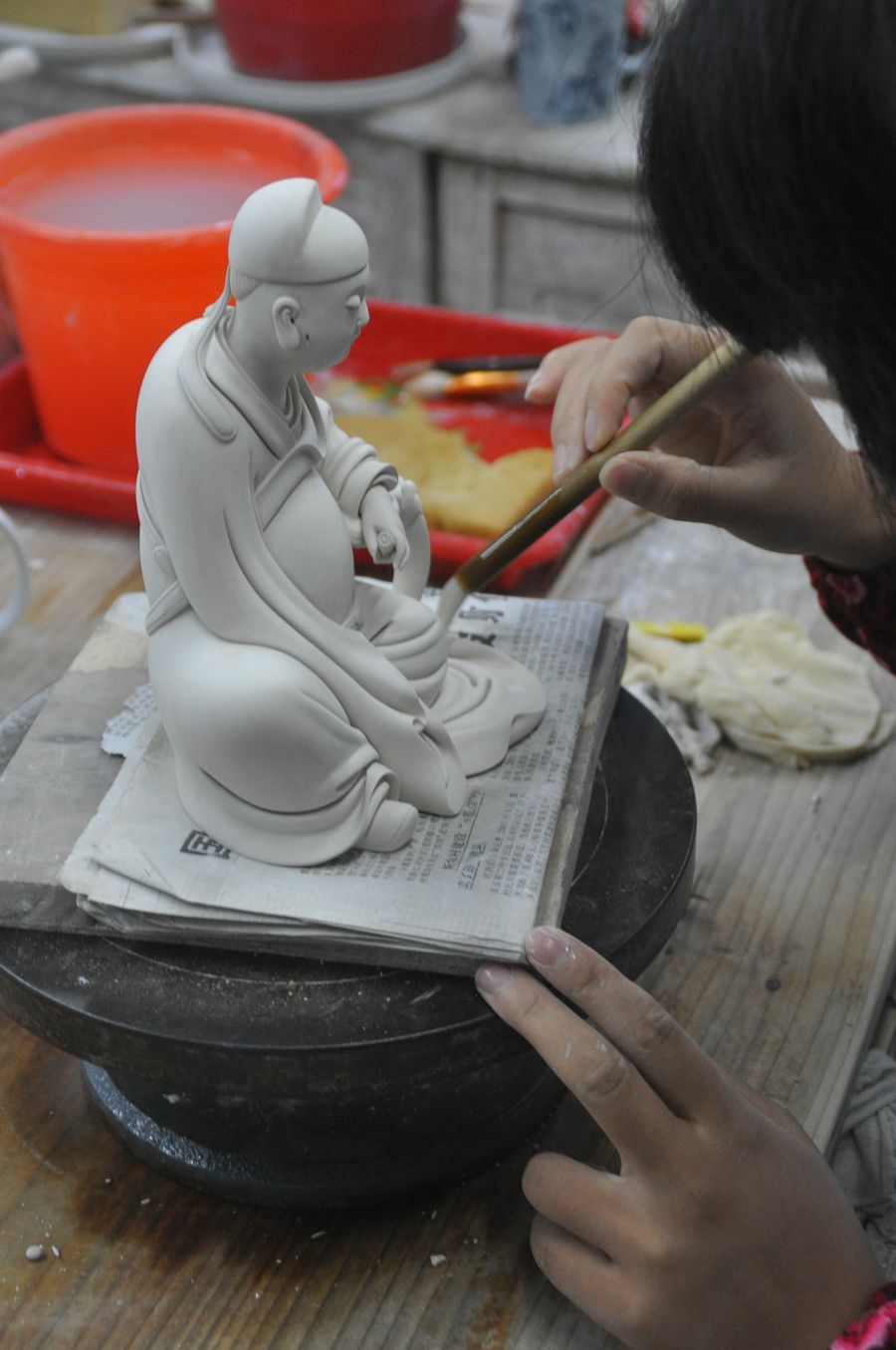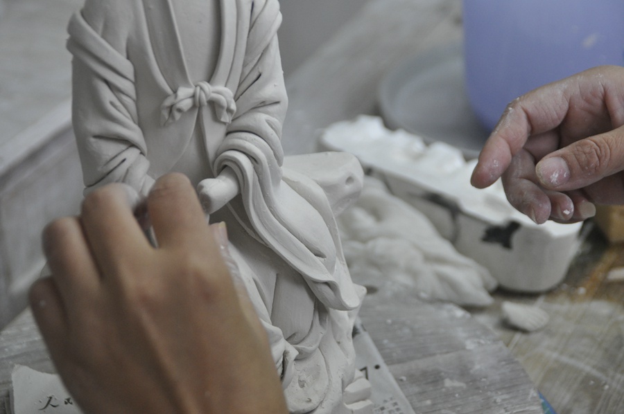 Chen Mingliang, a national inheritor of the Dehua porcelain technique, said porcelain carving combines the skills of stone carving, wood carving, and clay sculpture. According to him, craftsmen usually make greenware directly from high-quality kaolin by hand or apply the technique of slip casting, in which liquid clay is poured into plaster molds and allowed to form a layer, the cast, on its inside walls.