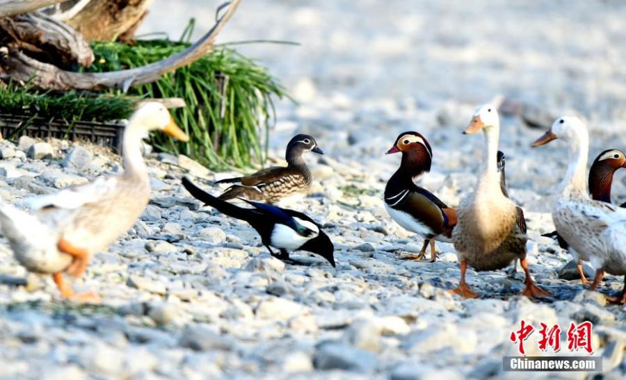 Wild mandarin ducks and farm-raised ducks live in harmony at Qinglilang River National Wetland Park in Xiangyang City, central China's Hubei Province, Dec. 4, 2021. (Photo: China News Service/ Xiong Mingyin)