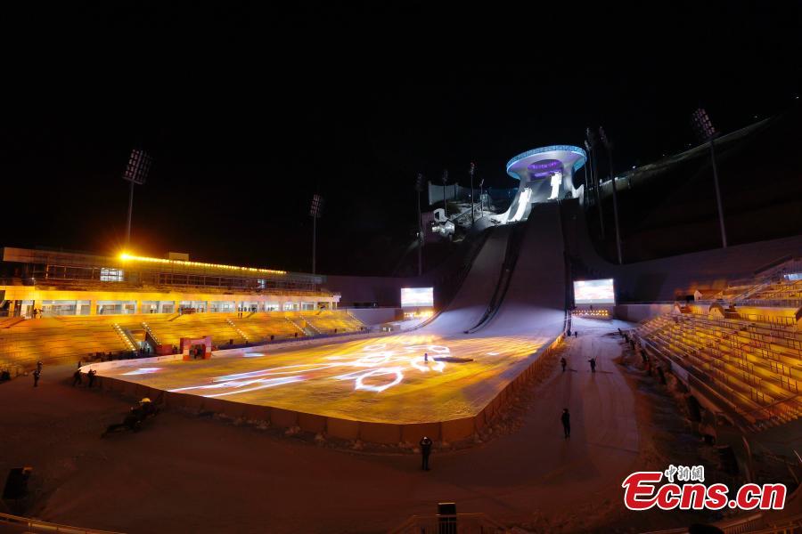The landscape lights in the National Ski Jumping Center are lit up in Chongli District of Zhangjiakou City, north China's Hebei Province, Dec. 4, 2021. (Photo: China News Service/Fu Tian)