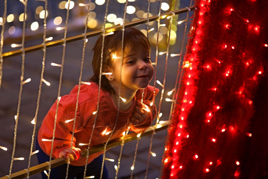 A child is seen in front of Christmas decorations in downtown Beirut, Lebanon, on Dec. 6, 2021. (Xinhua/Bilal Jawich)