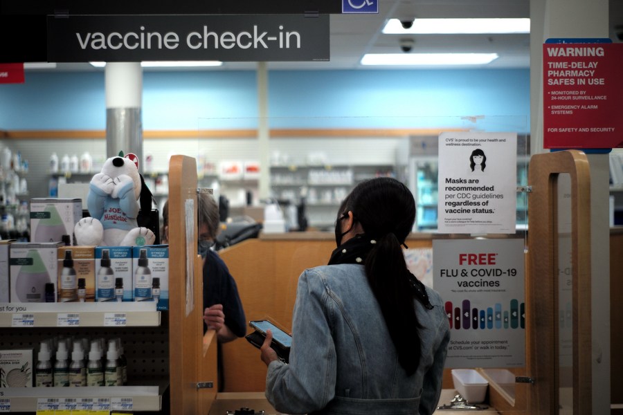 A woman waits for injection of COVID-19 booster vaccine in Burlingame, California, the United States, Dec. 4, 2021. (Xinhua/Wu Xiaoling)