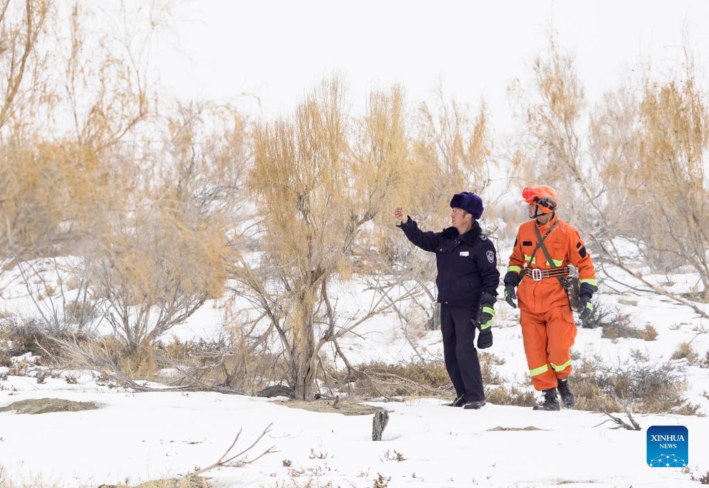 Staff member from a forest management and protection station, along with an emergency handling team of the Ganjia Lake forest region, check the growth of white saxaul trees in Wusu City of northwest China's Xinjiang Uygur Autonomous Region, Dec. 4, 2021. As winter approaches, authorities have been paying more attention to forest fire prevention in the Ganjia Lake forest region in the west of Junggar Basin. Forest rangers have also stepped up their patrolling efforts. In the Ganjia Lake forest region, there are 18 forest management and protection stations that are responsible for forest fireproofing, management of forest resources and grassland and wild animal protection. With improved transportation, staff members can now monitor a considerably larger area of woodland. The Ganjia Lake forest region, with an area of roughly 3,920,000 mu (about 2613.3 square kilometers) and over 110 plant species, serves as an important ecological protective screen for preventing land desertification. (Xinhua/Bai Zhiqiang)