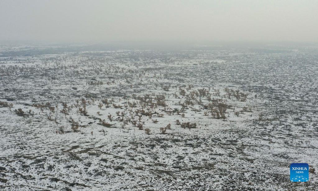 Aerial photo taken on Dec. 4, 2021 shows a view of the Ganjia Lake forest region in Wusu City of northwest China's Xinjiang Uygur Autonomous Region. As winter approaches, authorities have been paying more attention to forest fire prevention in the Ganjia Lake forest region in the west of Junggar Basin. Forest rangers have also stepped up their patrolling efforts. In the Ganjia Lake forest region, there are 18 forest management and protection stations that are responsible for forest fireproofing, management of forest resources and grassland and wild animal protection. With improved transportation, staff members can now monitor a considerably larger area of woodland. The Ganjia Lake forest region, with an area of roughly 3,920,000 mu (about 2613.3 square kilometers) and over 110 plant species, serves as an important ecological protective screen for preventing land desertification. (Xinhua/Zhao Ge)