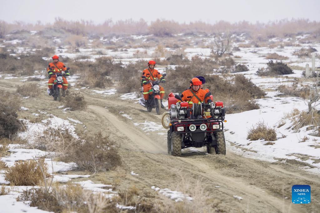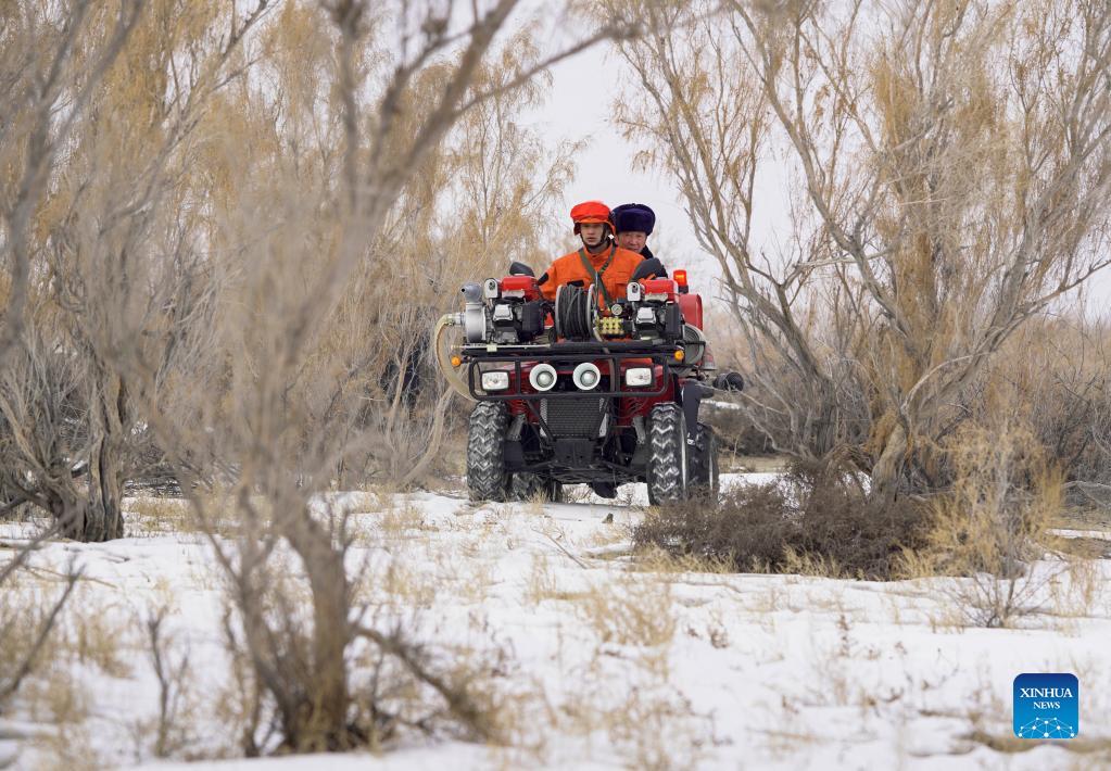 A staff member from a forest management and protection station, along with an emergency handling team of the Ganjia Lake forest region, patrol the Ganjia Lake forest region in Wusu City of northwest China's Xinjiang Uygur Autonomous Region, Dec. 4, 2021. As winter approaches, authorities have been paying more attention to forest fire prevention in the Ganjia Lake forest region in the west of Junggar Basin. Forest rangers have also stepped up their patrolling efforts. In the Ganjia Lake forest region, there are 18 forest management and protection stations that are responsible for forest fireproofing, management of forest resources and grassland and wild animal protection. With improved transportation, staff members can now monitor a considerably larger area of woodland. The Ganjia Lake forest region, with an area of roughly 3,920,000 mu (about 2613.3 square kilometers) and over 110 plant species, serves as an important ecological protective screen for preventing land desertification. (Xinhua/Bai Zhiqiang)